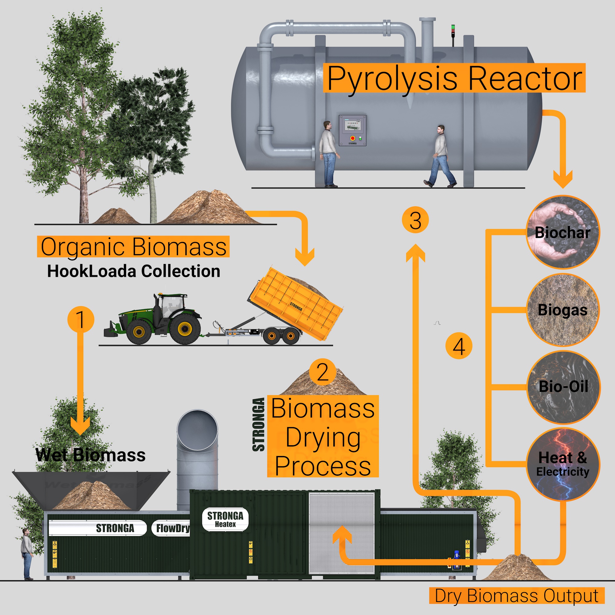 나무, 농업잔재, 목재칩 같은 바이오매스를 탄화시켜 바이오차(biochar)를 생산하는 설비.